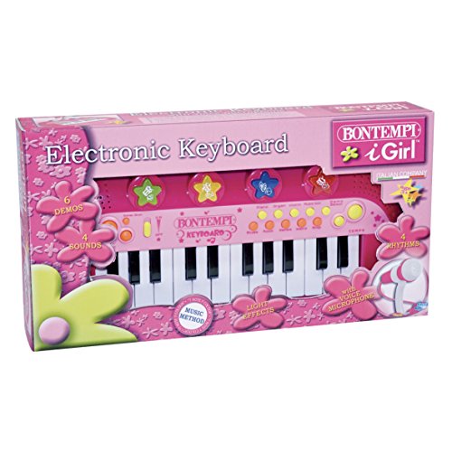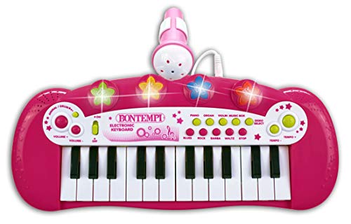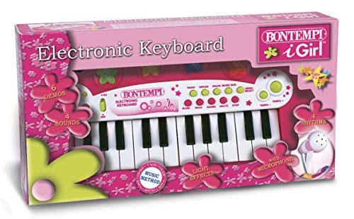Bontempi roze electronisch keyboard met microfoon and flashing light show. Met 24 toetsen, 4 kleurenpads, 4 verschillende geluidseffecten, 8 verschillende geprogrammeerde ritmes en 6 demo liedjes. Geschikt voor kinderen vanaf 3 jaar.