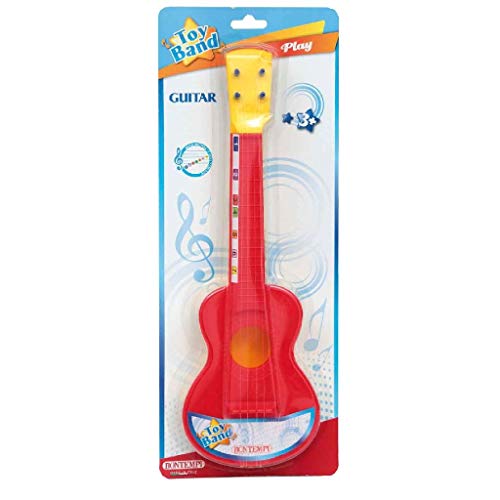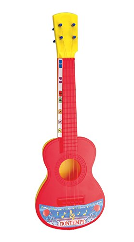 Vrolijk gekleurde gitaar van het Italiaanse merk Bontempi, voor de aller jongste muziekliefhebber. Met 4 verstelbare snaren en klankkast. De gekleurde nummers op de gitaar komen overeen op de achterkant van de verpakking. Op die manier kan het kind spelenderwijs een liedje leren spelen. Vervaardigd van kunststof. Geschikt voor kinderen vanaf 3 jaar. Verpakt op blisterkaart.