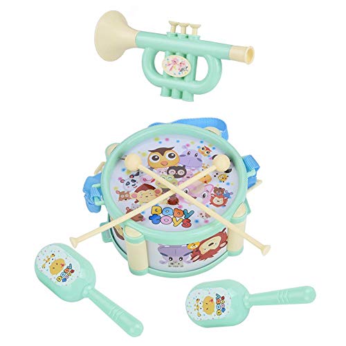 Gemaakt van hoogwaardig kunststof, veilig en niet giftig, valbestendig, duurzaam in gebruik. Deze speelgoedset bevat een trommel, een trompet, 2 zandhamers, 2 stokken, perfect cadeau voor je kinderen. Heeft fijne afwerking met kleurrijke en mooie uitstraling, die aantrekkelijk is voor kinderen. Verschillende instrumenten creëren verschillende geluiden, ontwikkelen audities van kinderen, tactiel gevoel, visueel gevoel en muzikale waarneming. Oefening baby atletisch vermogen, handflexibiliteit en hand-oog coördinatievermogen. Materiaal: kunststof.