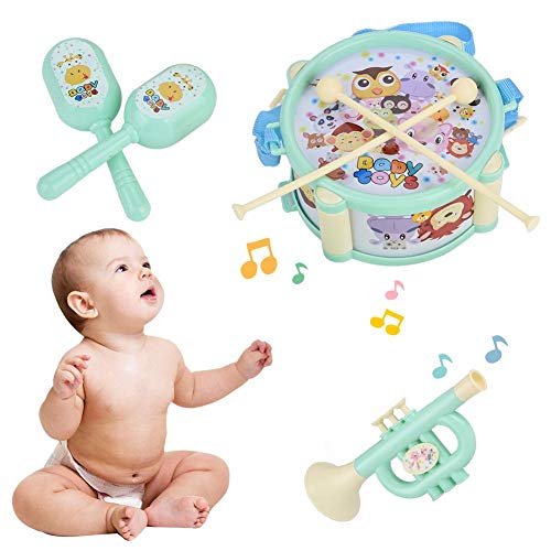 Deze kleurrijke speelgoedset bevat een trommel, een trompet, 2 zandhamers, 2 stokken. Ze zijn gemaakt van hoogwaardig ABS-materiaal, niet-giftig en geurloos, veilig om mee te spelen. Educatief speelgoed om het visuele gevoel van de baby te ontwikkelen, tactiel gevoel en muzikale interesse, perfect cadeau voor je kind.