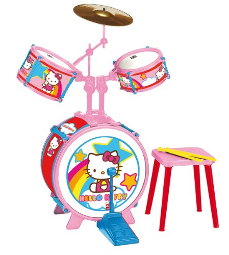 De slagwerkset Hello Kitty bestaat uit een bastrommel, 2 extra kleine trommels met 2 verschillende geluiden en bekken. Een professioneel voetpedaal en 2 stokken zijn er natuurlijk ook bij. Robuuste corpus, incl. kruk. Deze set zorgt voor leuke muzikale entertainment en is met het schattige katje een groot plezier voor alle fans van Hello Kitty. Niet geschikt voor kinderen onder 36 maanden.