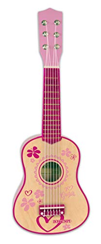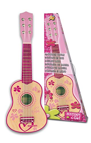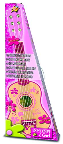 Roze houten kindergitaar met vrolijke meiden print van Bontempi. De 6 snaren kunnen gestemd worden, door aan de stemknoppen te draaien. Inclusief uitgebreide handleiding met bladmuziek en een plectrum. Het bespelen van een instrument bevordert de mentale ontwikkeling van kinderen al in de eerste jaren van het leven. Zelfs als de kleintjes nog geen goede notenreeksen kunnen spelen, moedigt het grijpen van de snaren en het horen van de geluiden de kinderen aan om zo’n speelgitaar te leren kennen. Lengte van de gitaar 55 cm. Geschikt voor kinderen vanaf 3 jaar. Wordt geleverd in doos met handvat.