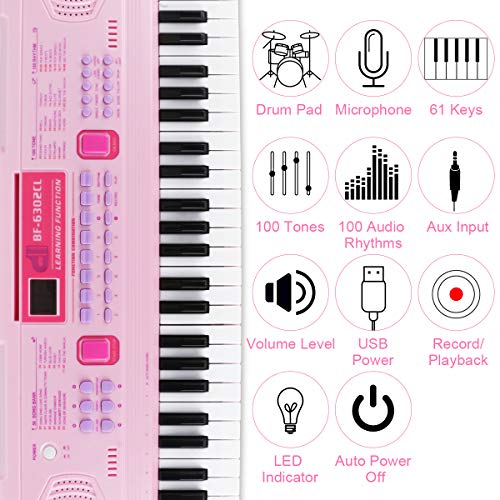 ★ Roze kleur, 100 geluiden en ritmen, 61 drumgeluiden, dier-geluid, gesimuleerd toetsenbord met 61 toetsen, nul essentiële pop-up melodie. Met veilige en milieuvriendelijke materialen, fijn vakmanschap en elegant randdesign worden kinderen niet beschadigd.